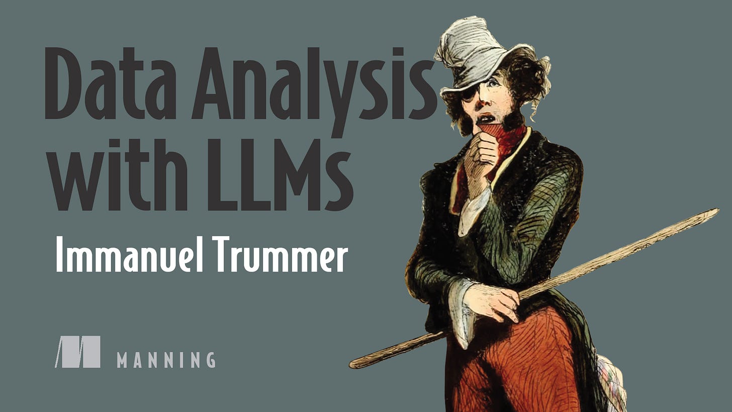 Manning Publications, purveyor of fine technology books, has graciously offered us several free copies of the e-book version of Data Analysis with LLMs by Immanuel Trummer to give away to members of the Charlottesville Data Science community.