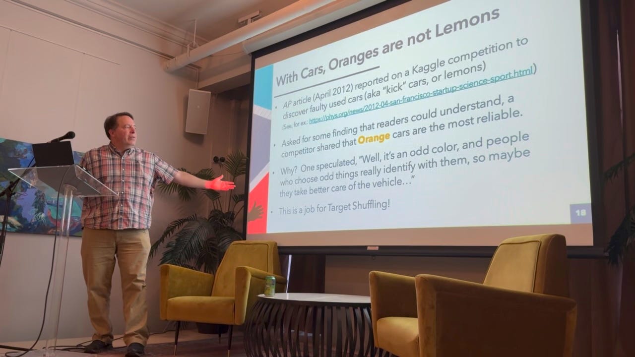 John Elder followed with the talk The Twin Crises of Science — and How to Defeat Them. John’s talk (1) described how scientific research in both academic and commercial settings can go awry surprisingly often, and (2) introduced a method, Target Shuffling, that better estimates the true significance of scientific findings, leading to increased trust and adoption of the results. His slides are available here.