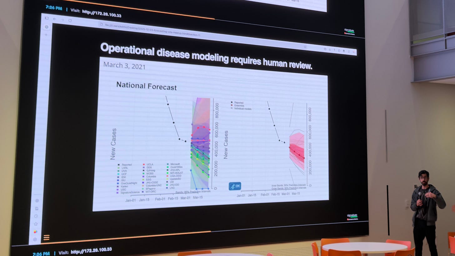 Thanks again to everyone who joined us at the UVA School of Data Science on Wednesday for Charlottesville Data Science’s December event! Aniruddha Adiga, a Research Assistant Professor at the UVA Biocomplexity Institute, and VP Nagraj, a practicing data scientist and Ph.D. candidate at the UVA School of Data Science, gave back-to-back talks, sharing insights into how their teams are applying modern data science tools and techniques to real-world epidemic forecasting.